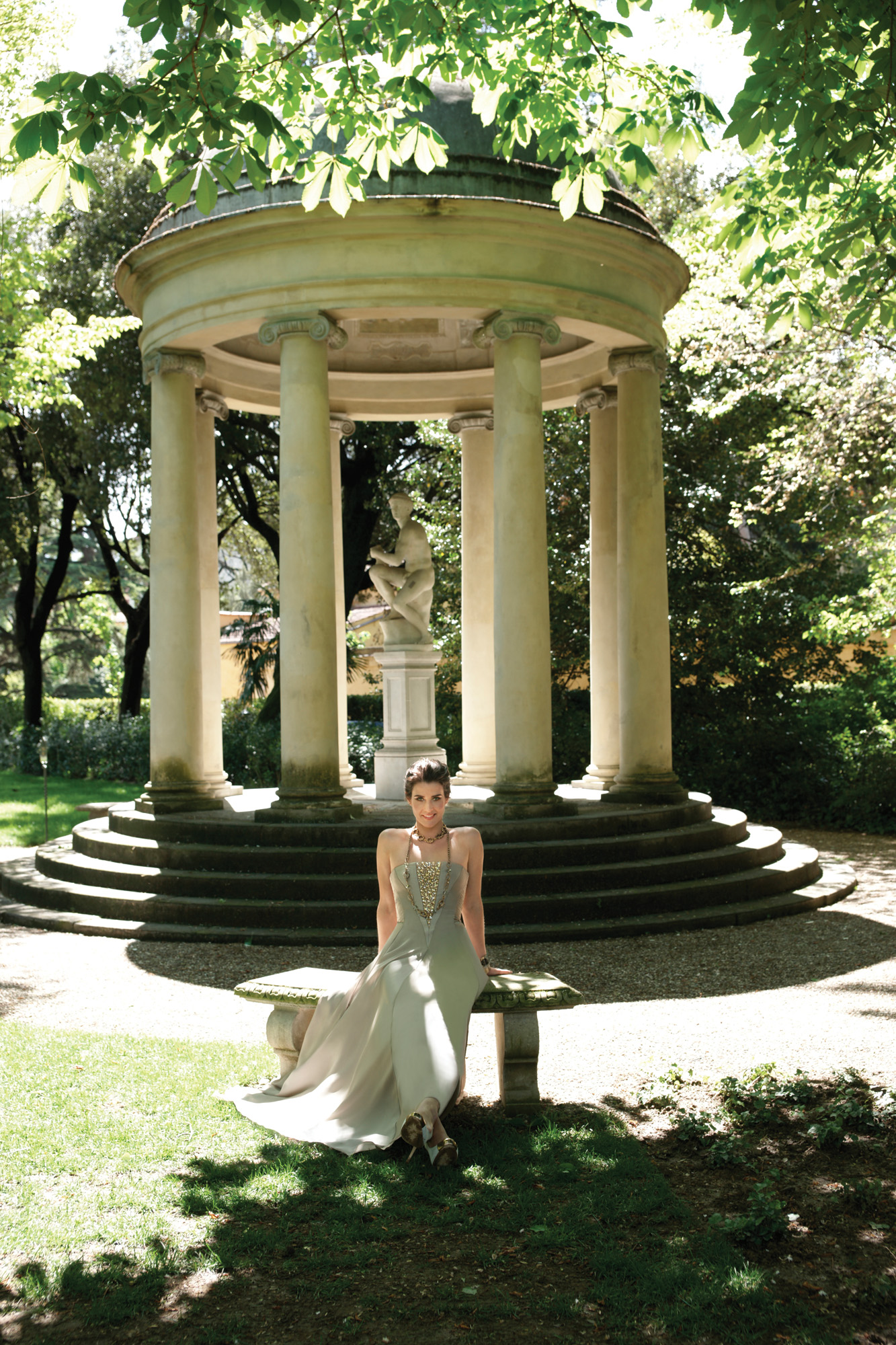 Cobie reclines on the Temple Lawn in Gherardesca park, part of an 11-acre private garden owned by Four Seasons Hotel Firenze. Silk dress and shoes by Blumarine. Long necklace by Edward Achour. Short necklace by Sharra Pagano. Bracelet by Valentina Brugnatelli.