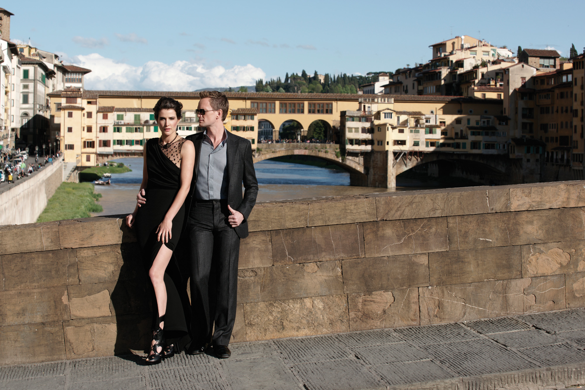 Neil and Cobie pause a moment before Florence’s famed bridge, the Ponte Vecchio. Cobie’s dress by Max Mara. Necklace by Sharrra Pagano. Sandals by Bottega Veneta. Neil’s clothing all by Giorgio Armani. Shoes by Prada. Sunglasses, Neil’s own.