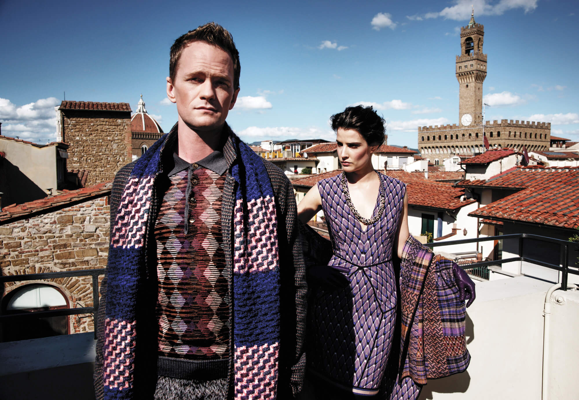 Neil’s jacket, sweater, scarf and pants, all by Missoni. Cobie’s dress, cape and necklace, all by Missoni. Gloves by Sermoneta.