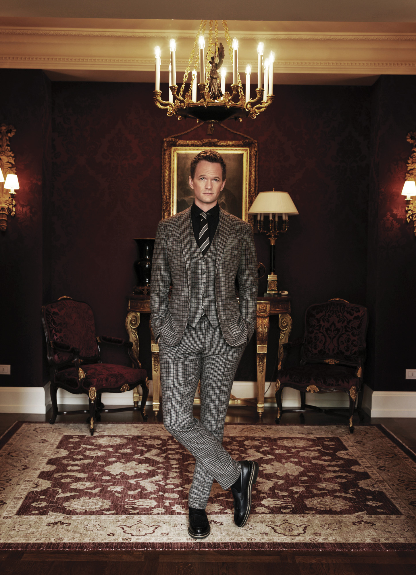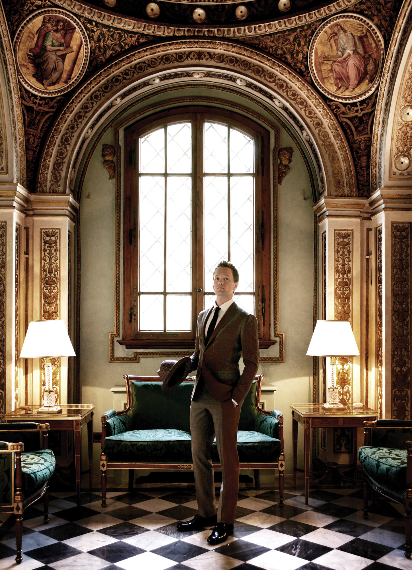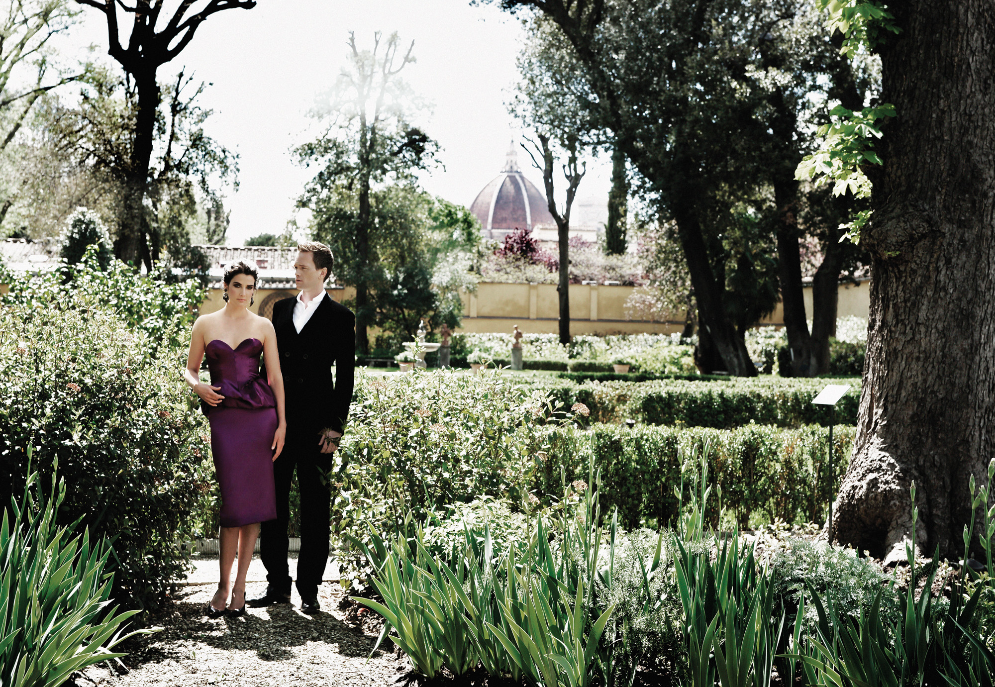 Cobie and Neil gaze from the hotel’s Gherardesca garden. Cobie’s bustier, pencil skirt and earrings by Ermanno Scervino. Shoes by Alberta Ferretti. Neil Patrick Harris’ shirt and velvet suit by Giorgio Armani. Shoes by Prada.