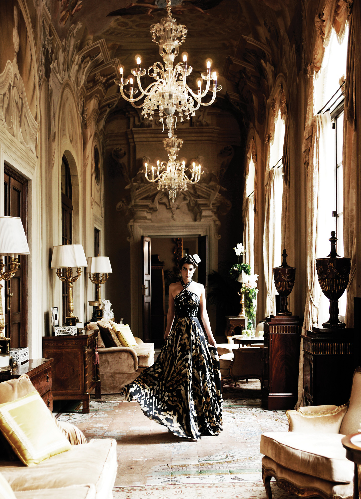Cobie Smulders walks through the frescoes gallery in the Royal Suite of Four Seasons Hotel Firenze. Silk dress by Blumarine. Hat by Borsalino. Sandals by Alberta Ferretti.